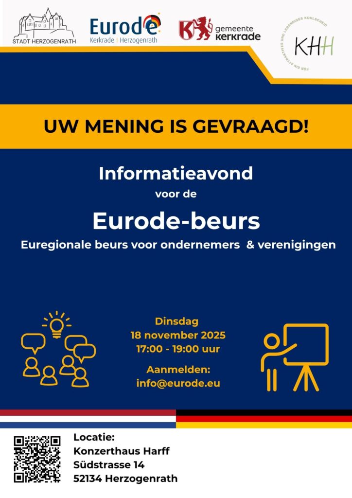 Met als doel ondernemers, vertegenwoordigers van verenigingen en betrokken mensen uit Herzogenrath en Kerkrade samen te brengen, nieuwe contacten te leggen, ideeën uit te wisselen en grensoverschrijdende netwerken te versterken, organiseert het Eurode Zweckverband momenteel een grote Eurode-beurs, die op 24 september 2026 in het Flexiforum in Kerkrade zal plaatsvinden. Om de inhoud af te stemmen en het programma nauwkeurig uit te werken, vindt er op 18 november 2025 vanaf 17 uur een informatieavond plaats in het Konzerthaus Harff in Kohlscheid. Het evenement dient om het Eurode-concept en de tot nu toe behaalde successen van de grensoverschrijdende samenwerking te presenteren en nieuwe mogelijkheden voor samenwerking te laten zien. Daarnaast zal er worden gesproken over de programmaonderdelen van de beurs in het komende jaar.